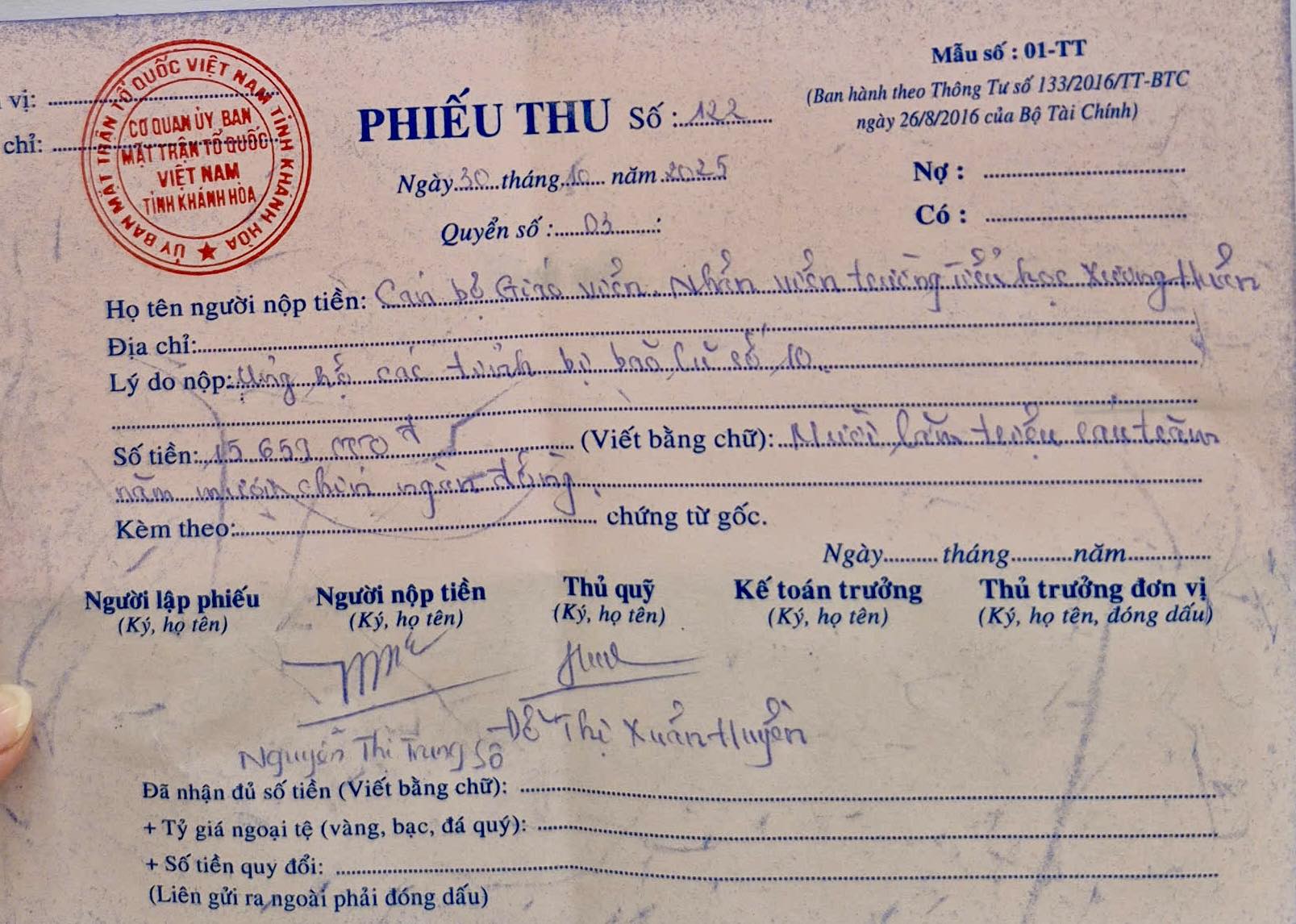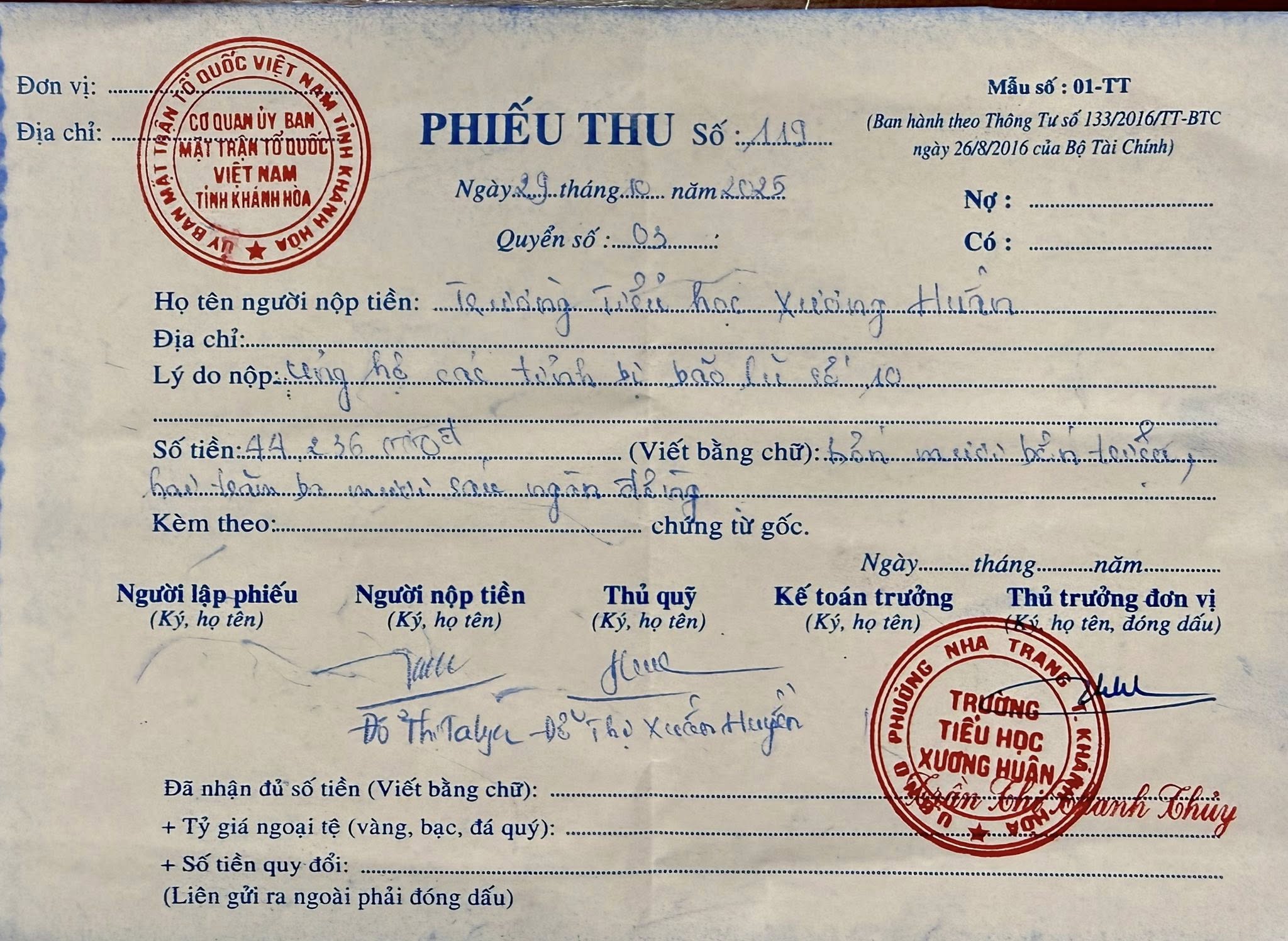 Số tiền trên đã được gửi về Văn phòng Uỷ ban MTTQ Việt Nam tỉnh Khánh Hoà số 02 Ngô Quyền, phường Nha Trang (Đt: 02583 822 955) vào sáng nay ngày 29/10/2025.